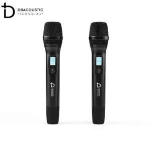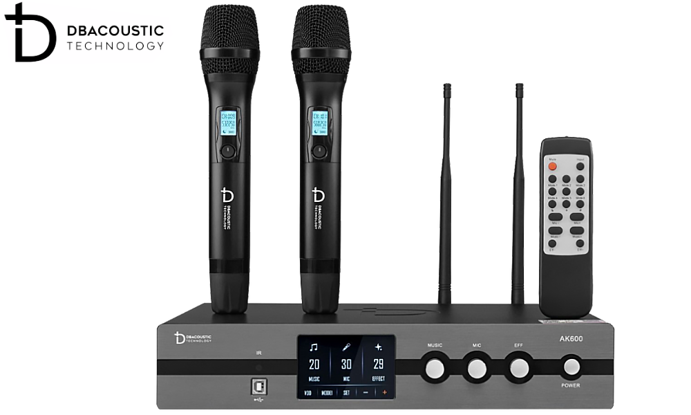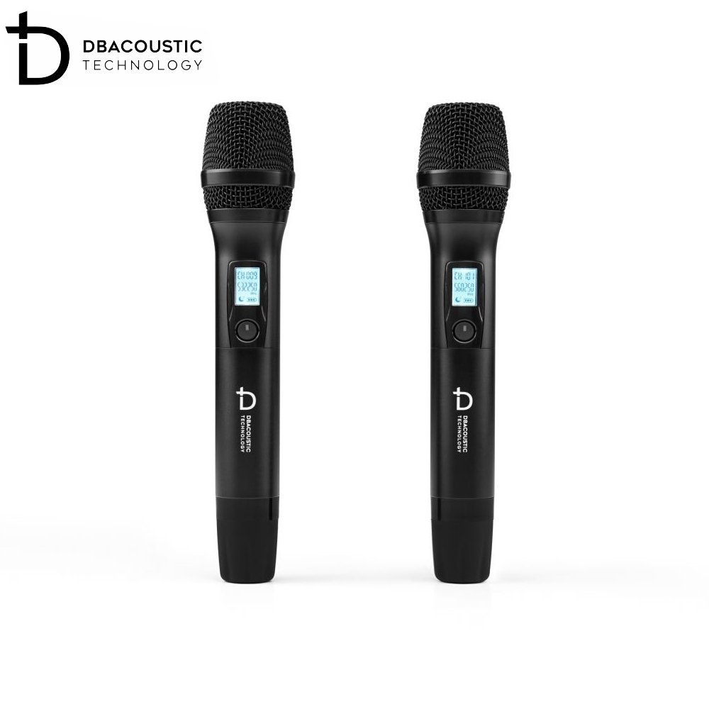 Bộ sản phẩm còn có 2 tay micro không dây Dbacoustic nhỏ gọn, làm bằng hợp kim phủ nano chống trầy xước, chống bám vân, tạo cảm giác thoải mái cho người dùng khi cầm nắm. Trên thân micro không dây này cũng được trang bị 1 màn hình LCD nhỏ hiển thị tần số, dung lượng pin và 1 nút nguồn mềm, rất dễ thao tác.