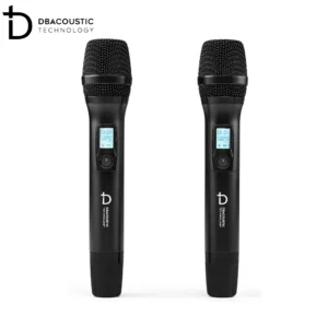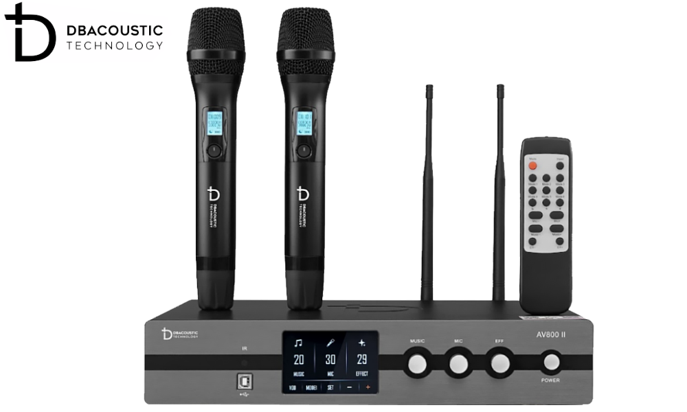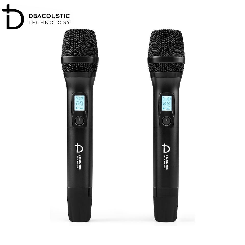 Bộ sản phẩm còn có 2 tay micro không dây Dbacoustic nhỏ gọn, làm bằng hợp kim phủ nano chống trầy xước, chống bám vân, tạo cảm giác thoải mái cho người dùng khi cầm nắm. Trên thân micro không dây này cũng được trang bị 1 màn hình LCD nhỏ hiển thị tần số, dung lượng pin và 1 nút nguồn mềm, rất dễ thao tác.
