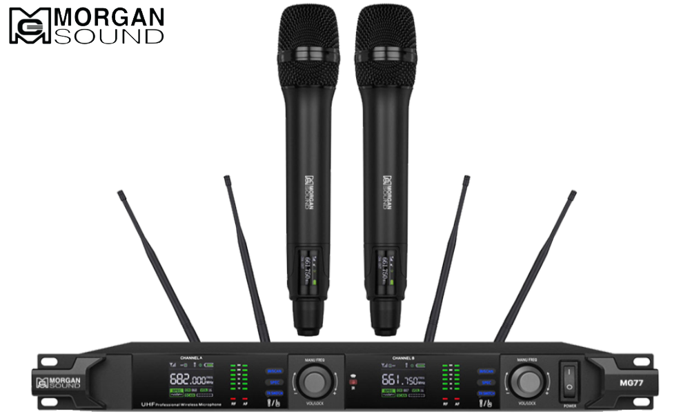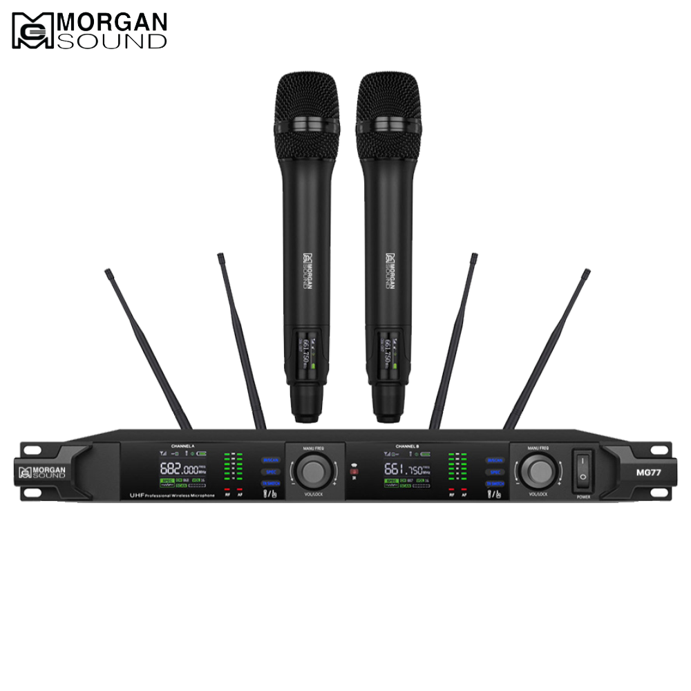 Micro không dây Morgan Sound MG77 là dòng micro không dây cao cấp được nhập khẩu và phân phối bởi công ty INTEK. Micro Không Dây MORGAN SOUND MG77 sử dụng công nghệ hoàn toàn mới, đem lại chất âm vượt trội hoàn toàn so với dòng micro thông thường. Đây là dòng micro không dây có thể sử dụng cho các phòng hát karaoke chuyên nghiệp hoặc các dàn âm thanh sự kiện cao cấp.