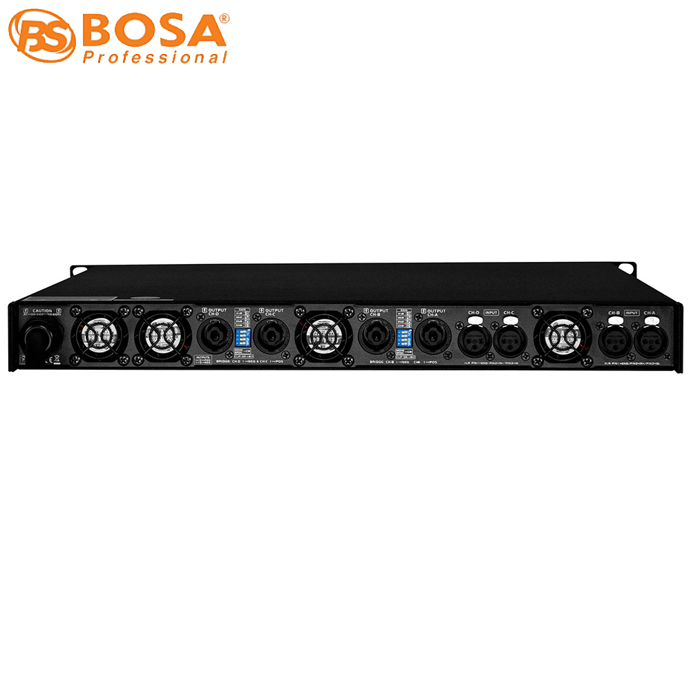 Mặt sau Main Đẩy Công Suất Bosa DS5800 có 4 cổng in-out bằng jack Canon để nhận và truyền tín hiệu tốt hơn, ổn định hơn, có 4 jack loa chuyên dụng để truyền tải tín hiệu ra loa tốt hơn, chắc chắn và ổn định, ngoài ra còn được trang bị 4 cái quạt tản nhiệt giúp thiết bị hoạt động liên tục trong thời gian dài mà không bị nóng.