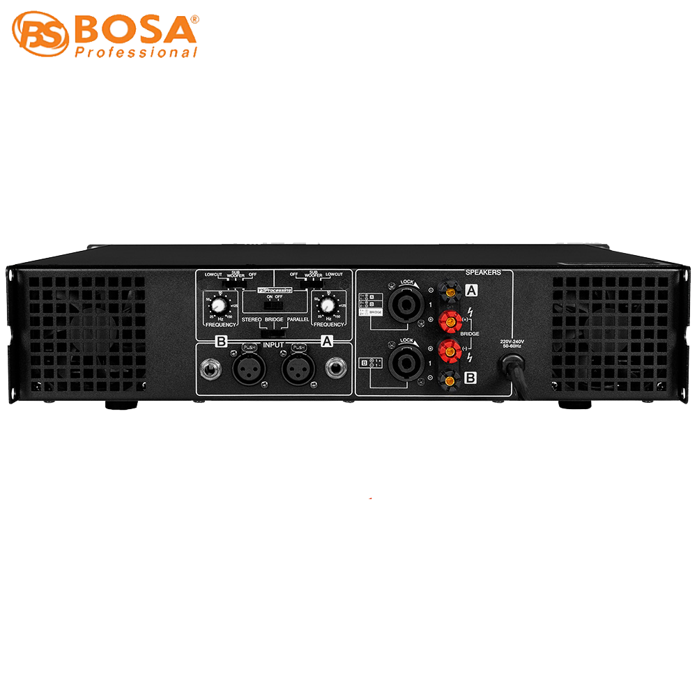 Mặt sau main Bosa DZ800 có 2 cổng in-out bằng jack Canon để nhận và truyền tải tín hiệu tốt hơn, ổn định hơn và còn có 2 cổng out ra loa bằng jack loa chuyên dụng để truyền tín hiệu ra loa tốt hơn, ổn định hơn, chuyên nghiệp hơn, ngoài ra còn được trang bị 2 cái quạt tản nhiệt ở hai bên để đẩy hơi nóng ra ngoài cho thiết bị hoạt động liên tục mà không bị nóng.