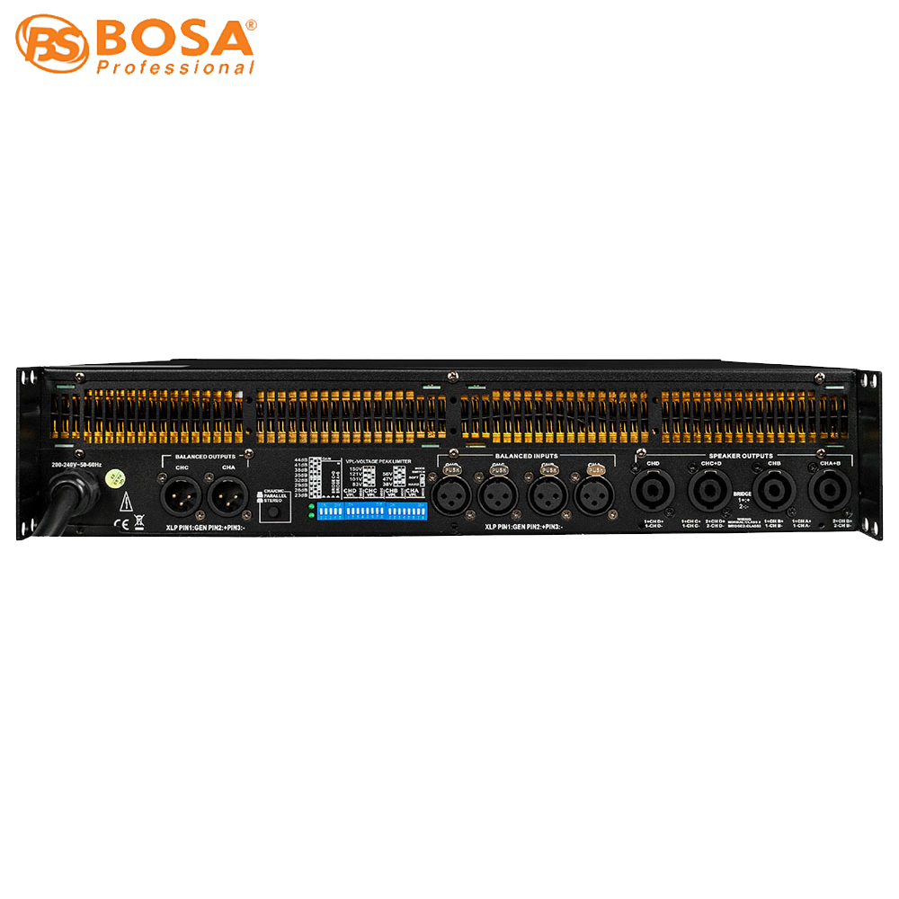 Mặt sau main Bosa FP20000Q có các thông số cơ bản, có 4 cổng nhận tín hiệu và 2 jack truyền tín hiệu bằng jack Canon để nhận và truyền tín hiệu tốt hơn, ổn định hơn, an toàn hơn và còn có 4 cổng out của 4 kênh ra loa bằng jack loa chuyên dụng để truyền tải tín hiệu ra loa tốt hơn, ổn định hơn, chắc chắn hơn và chuyên nghiệp hơn, phía trên có các khe để tản nhiệt giúp sản phẩm không bị nóng khi hoạt động ở thời gian dài.