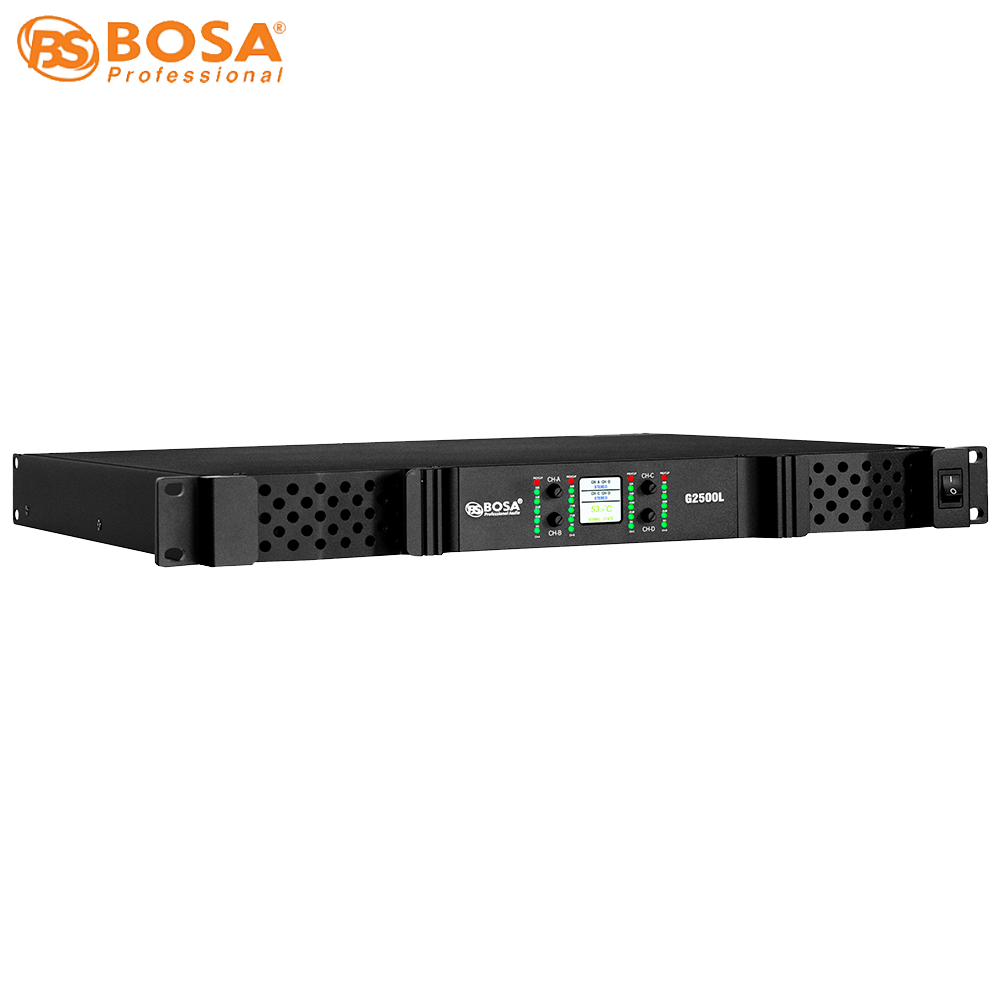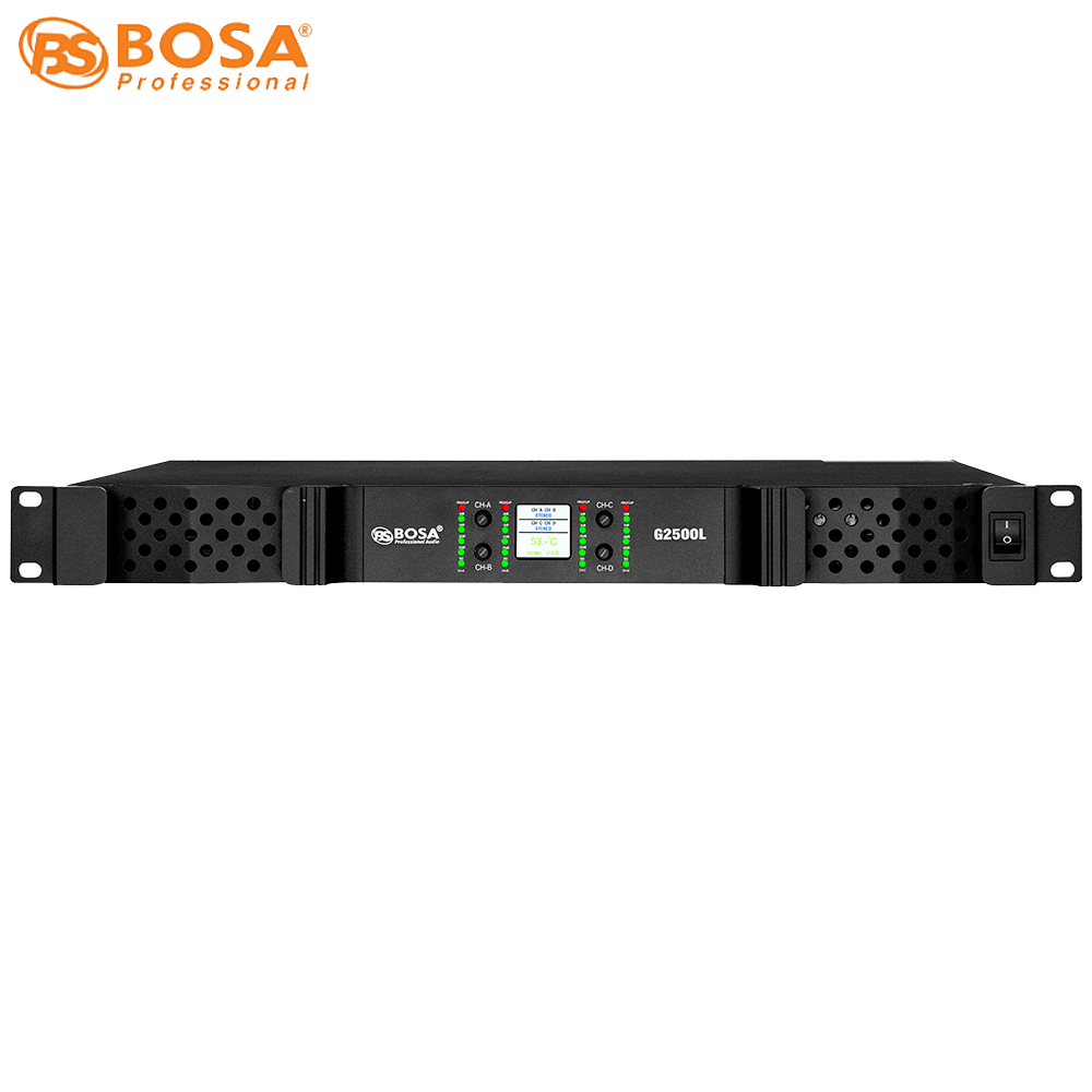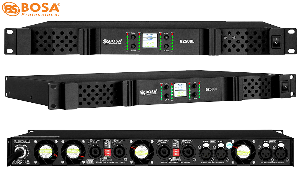 Mặt trước Đẩy Công Suất Bosa G2500L được thiết kế đơn giản nhưng vẫn có đầy đủ các logo và model của sản phẩm, với màu đen sang trọng, mạnh mẽ và có màng lưới tản nhiệt để hơi nóng được đẩy ra ngoài, có 4 nút điều chỉnh cho 4 kênh nằm ở giữa nhỏ gọn.