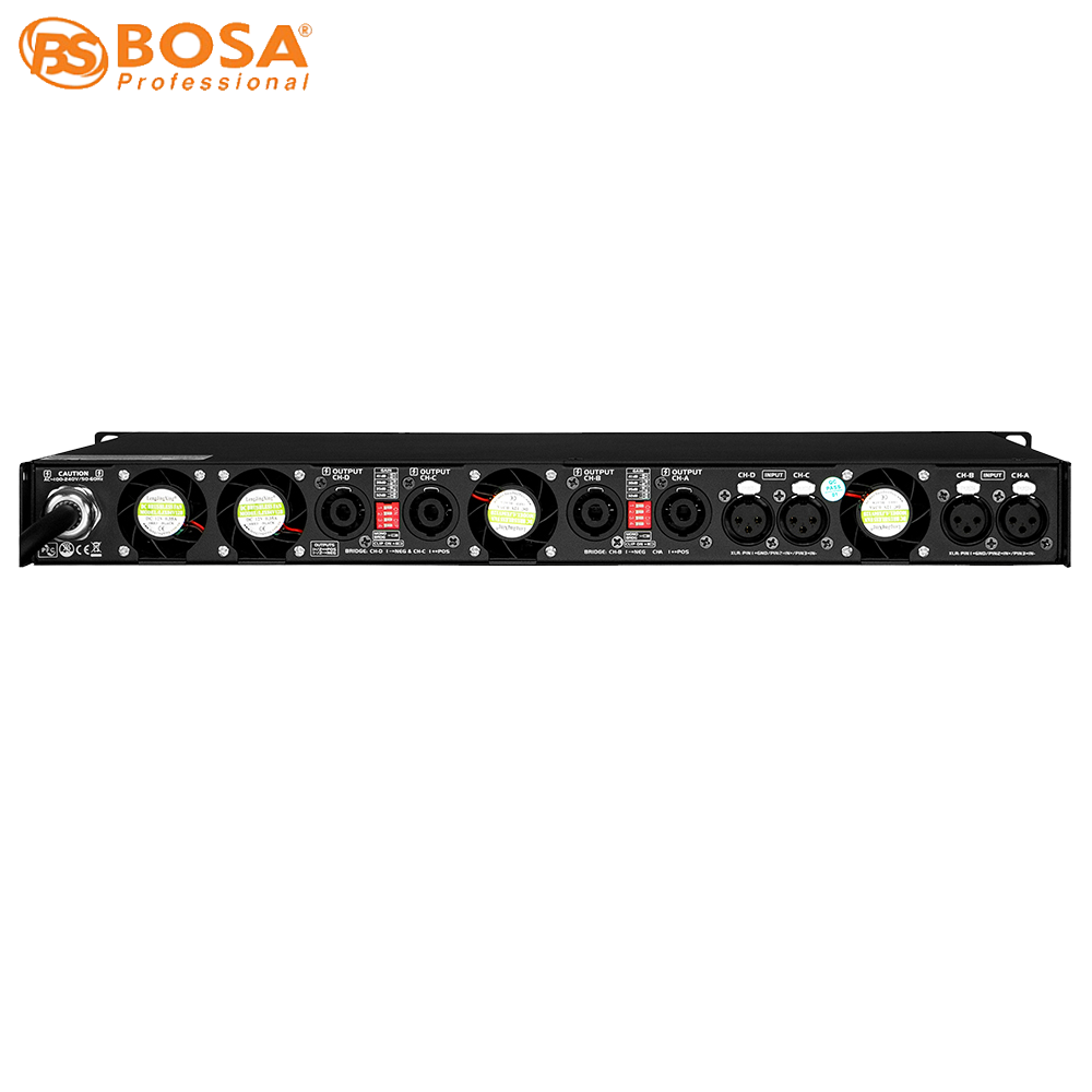 Mặt sau Main Đẩy Công Suất Bosa G2500L có 4 cổng in-out bằng jack Canon để nhận và truyền tín hiệu tốt hơn, ổn định hơn, có 4 jack loa chuyên dụng để truyền tải tín hiệu ra loa tốt hơn, chắc chắn và ổn định, ngoài ra còn được trang bị 4 cái quạt tản nhiệt giúp thiết bị hoạt động liên tục trong thời gian dài mà không bị nóng.