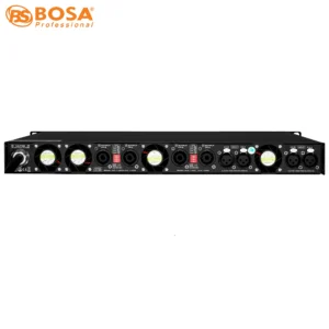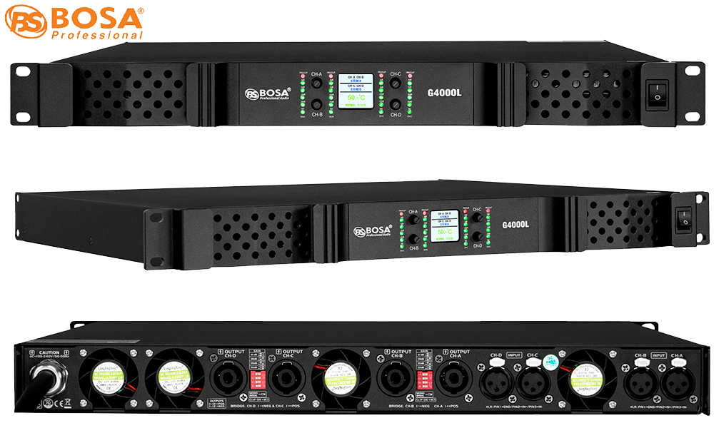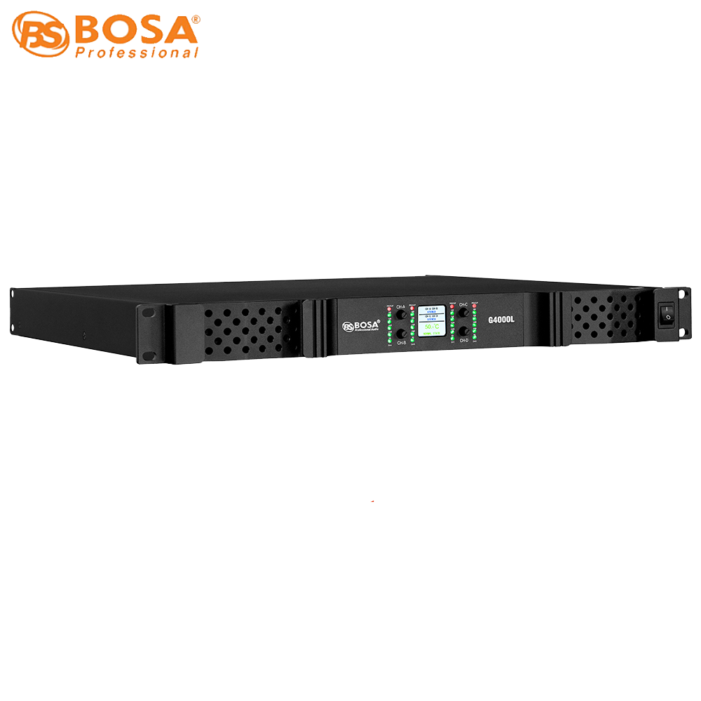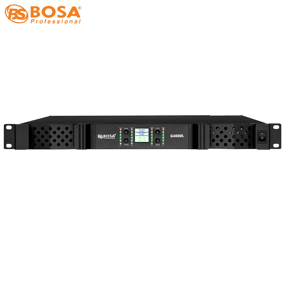 Mặt trước Đẩy Công Suất Bosa G4000L được thiết kế đơn giản nhưng vẫn có đầy đủ các logo và model của sản phẩm, với màu đen sang trọng, mạnh mẽ và có màng lưới tản nhiệt để hơi nóng được đẩy ra ngoài, có 4 nút điều chỉnh cho 4 kênh nằm ở giữa nhỏ gọn.