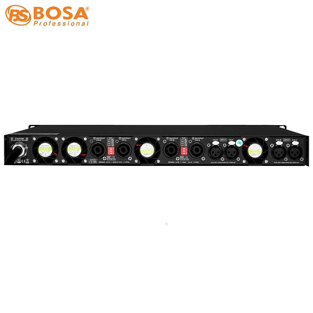 Mặt sau Main Đẩy Công Suất Bosa G4000L có 4 cổng in-out bằng jack Canon để nhận và truyền tín hiệu tốt hơn, ổn định hơn, có 4 jack loa chuyên dụng để truyền tải tín hiệu ra loa tốt hơn, chắc chắn và ổn định, ngoài ra còn được trang bị 4 cái quạt tản nhiệt giúp thiết bị hoạt động liên tục trong thời gian dài mà không bị nóng.