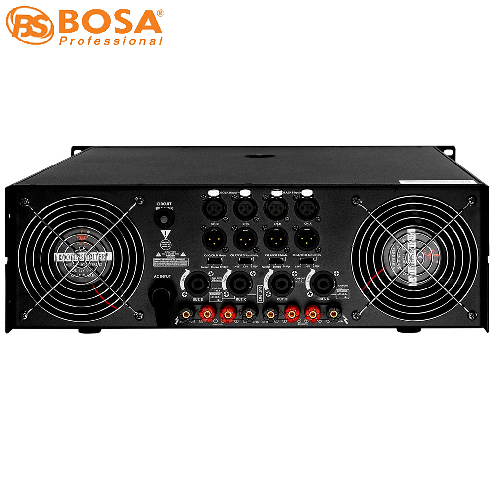 Mặt sau Bosa MX83000 Plus có 4 cổng in-out bằng jack Canon để nhận và truyền tín hiệu tốt hơn và ổn định hơn, có 4 cổng out ra loa bằng jack chuyên dụng để truyền tải tín hiệu ra loa tốt hơn và chuyên nghiệp hơn, còn có 4 jack out ra loa bằng jack thông thường để phù hợp với tất cả các loại dây truyền và loa mà bạn đang có rất tiện dụng, ngoài ra còn được trang bị 2 cái quạt tản nhiệt ở 2 bên giúp thiết bị hoạt động liên tục mà không bị nóng.