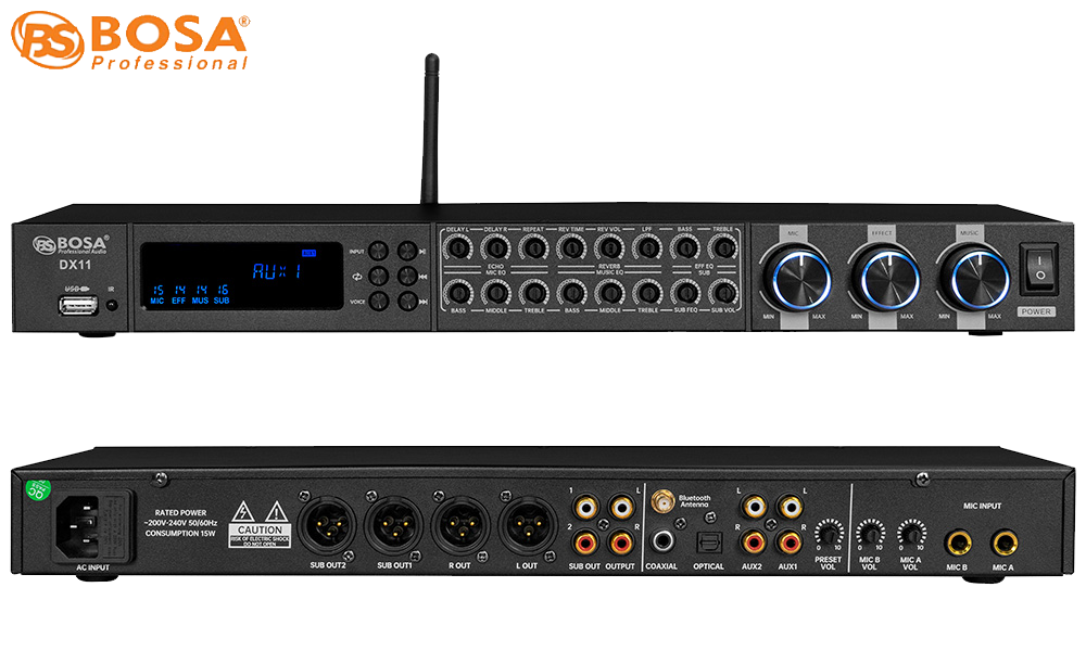 Vang cơ Karaoke Bosa DX11 là một sản phẩm được phát triển bởi đơn vị âm thanh hàng đầu Bosa. Sản phẩm ra mắt thị trường nhanh chóng nhận được sự quan tâm từ giới âm thanh với thiết kế hiện đại, sang trọng cùng khả năng vận hành ổn định, xử lý âm thanh tốt. Mixer Vang cơ Karaoke Bosa DX11 là lựa chọn lý tưởng dành cho dàn âm thanh gia đình đến dàn âm thanh chuyên nghiệp.