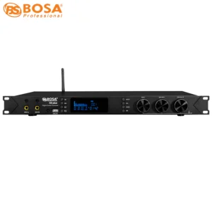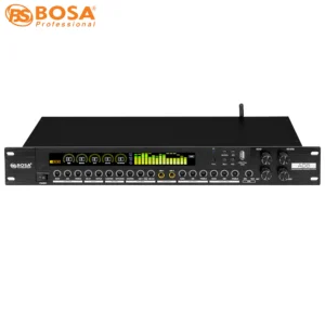 Bên cạnh đó, mặt trước có màn hình LCD hiển thị các thông tin, thông số khi hoạt động của vang số. Nút FBX chống hú, người dùng có thể điều chỉnh bằng tay dễ dàng, nút thay đổi nguồn nhạc Exciter.