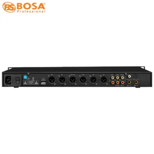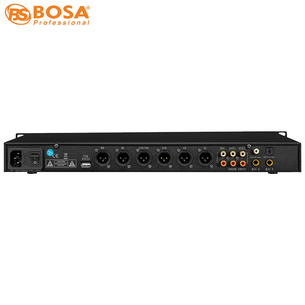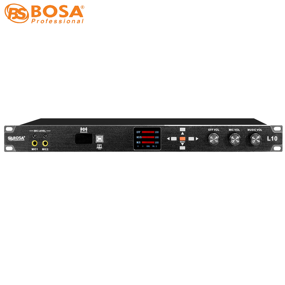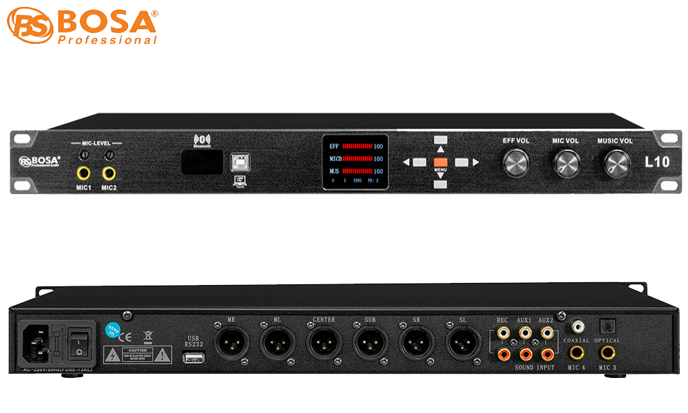 Mặt trước Vang số Bosa L10 này có đầy đủ logo và model của sản phẩm với chữ màu trắng nổi bật lên trên nền đen, được trang bị 1 màn hình LED bắt mắt để hiển thị thông số cấu hình của sản phẩm như Music, Echo, Reverb,…, có các nút tinh chỉnh màu đen bằng tay tiện lợi, còn được trang bị thêm cổng USB để kết nối với phần mềm trên máy tính để điều chỉnh âm thanh sâu hơn, chuyên nghiệp hơn để cho ra một âm thanh tốt nhất.