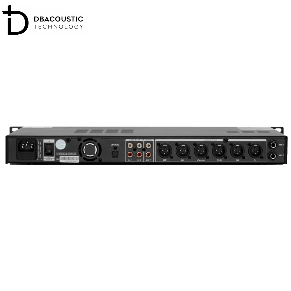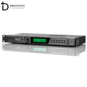 Mặt trước thiết bị là màn hình LED, hệ thống núm vặn, nút điều chỉnh với nhiều chú thích rõ ràng và chi tiết thích hợp cho người dùng. Logo DBacoustic và tên sản phẩm được thiết kế nổi bật đối xứng tăng độ nhận diện cho thương hiệu.