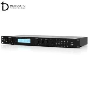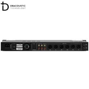 Mặt trước thiết bị là màn hình LED, hệ thống núm vặn, nút điều chỉnh với nhiều chú thích rõ ràng và chi tiết thích hợp cho người dùng. Logo DBacoustic và tên sản phẩm được thiết kế nổi bật đối xứng tăng độ nhận diện cho thương hiệu.